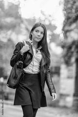 Young woman walking in city street, autumn lifestyle wearing fashion outfit clothing. urban professional girl in black leather jacket, leggings, skirt, boots. Trendy modern multiracial Asian model.