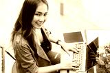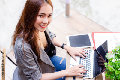 Attractive beautiful businesswoman get enjoying life because charming beautiful young woman can do her work everywhere by using laptop computer, online internet, smiley face. Gorgeous girl feel happy
