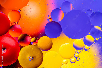 Abstract colorful background with oil drops and reflections on water surface. Cosmic abstract image