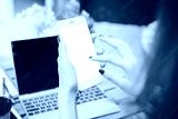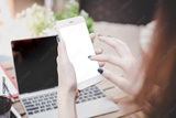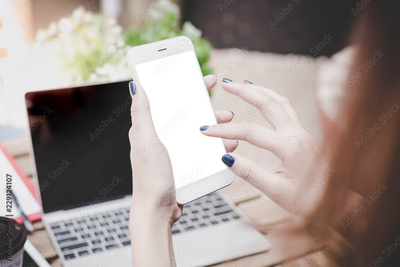 Attractive beautiful woman use phone or smartphone for paying bills or using internet banking or financial planning. Business woman use finger touching on phone isolated on white of screen phone space