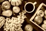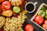 Ripe apples in a box with pumpkins, apples, grapes, pears and cup of coffee on dark wooden background. Autumn seasonal image. Top view