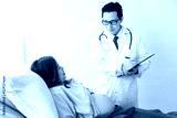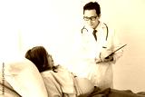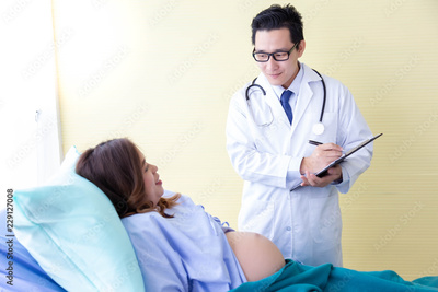 Handsome young doctor tell results of her health and her fetus that beautiful mom or mother, her child have good health. Doctor is checking and writing paperwork and look after his patient in hospital