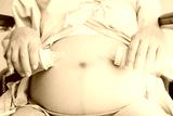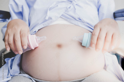 Attractive beautiful pregnant woman is holding milk bottles and acts like a feed baby or fetus at belly in hospital room. Beautiful mother has twin babies. She feels lucky and happiness of life