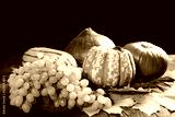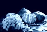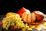 Ripe grapes, marrow and pumpkins on dark wooden background and colorful autumn maple leaves. Autumn seasonal image.