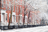 Snow covered sidewalks and buildings along Washington Square Park in Manhattan, New York City