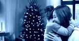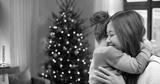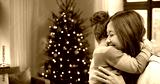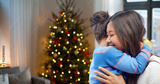 family, holidays and happiness concept - happy mother hugging her daughter over christmas thee lights background