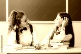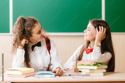 2 schoolgirls in school uniform sit on the background of a green board at the desk with books