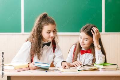 2 schoolgirls in school uniform sit on the background of a green board at the desk with books