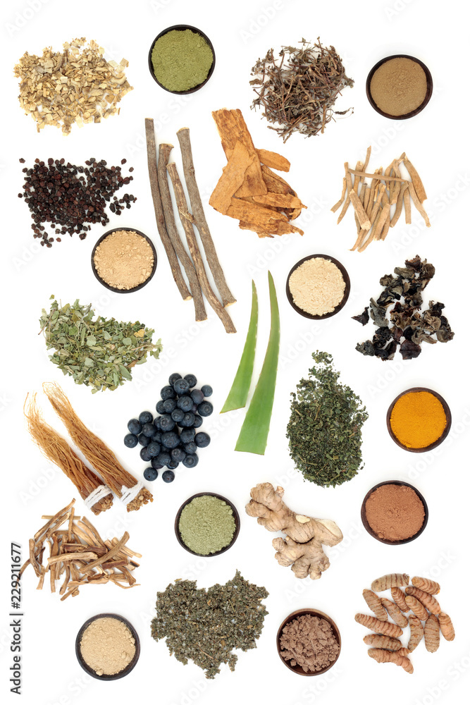 Adaptogen food selection with herbs, spices, fruit & supplement powders. Used in herbal medicine to help the body resist the damaging effect of stress & restore normal physiological functioning.