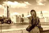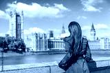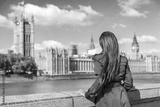 London Westminster Europe city travel urban tourist woman looking at parliament and Thames river, famous tourism attraction landmark. Autumn season people lifestyle.