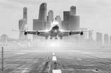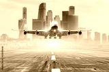 Commercial airplane jetliner approaching for landing on runway, modern city on background.
