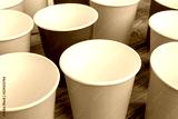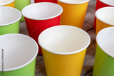 Arrangement of recycling disposable colorful paper cups, glass of red, yellow and green color