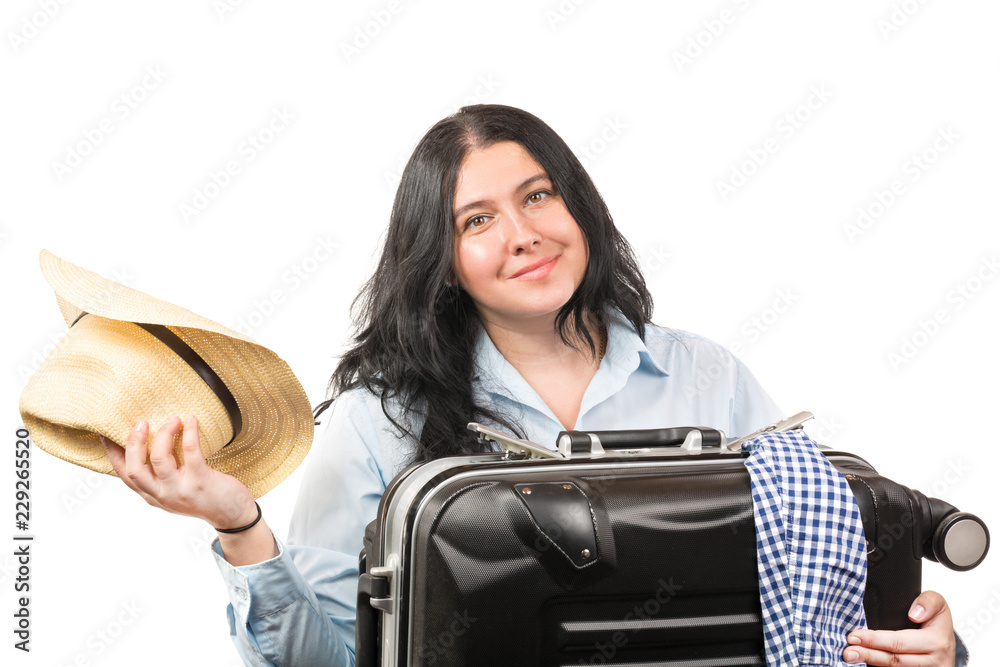 Beautiful young smiling brunette woman with hat in her hand and suitcase isolated on white background. Tourism concept.