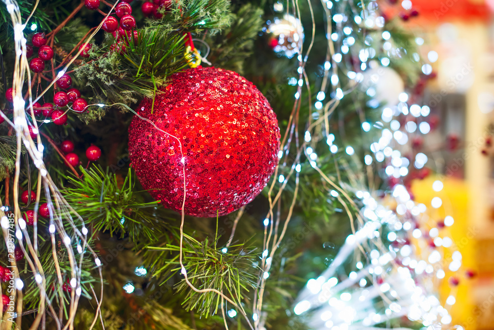 Close up red sequins bauble hanging on decorated with lights Christmas tree. Christmas decorations on a spruce branch. Soft selective focus, copy space.