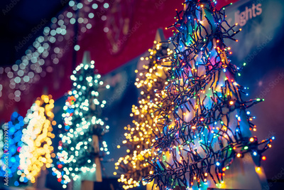 Various Colorful glowing Christmas led lights garlands in the shop display. Holiday background. Xmas holiday decoration market. Selective focus. copy space.