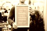 Caucasian man's hands holding motivational message typing on the wooden board. Everyday Inspirational quotes concept. Vintage styled toning. Close up, Selective focus.