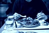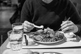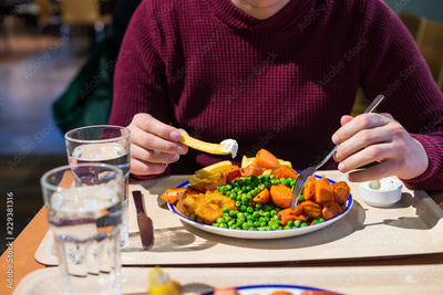 Young man holding cutlery and eating traditional English dish - fish and chips with green peas, stewed carrot and tartar sause. Fast food, cafe business lunch concept. Selective focus, copy space.
