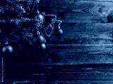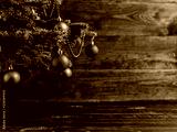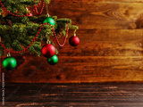 Christmas tree, dressed up balls, stands on a wooden table. Copy space.