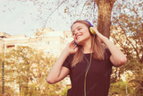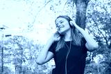 beautiful young blond girl with headphones outdoor listening music and smiling holding smartphone teenage fun concept