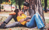 Meeting in the park. Romantic couple sitting under the tree in the park. Love, dating, romance