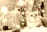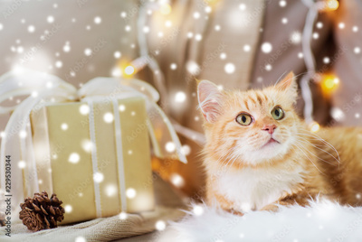 pets, christmas and hygge concept - red tabby cat on sofa with present at home over snow