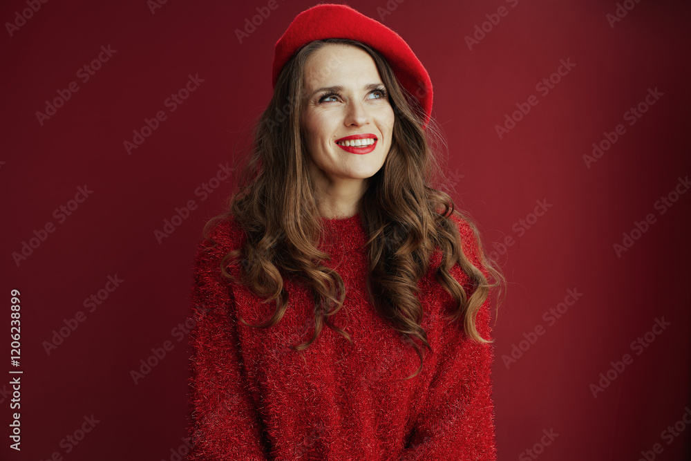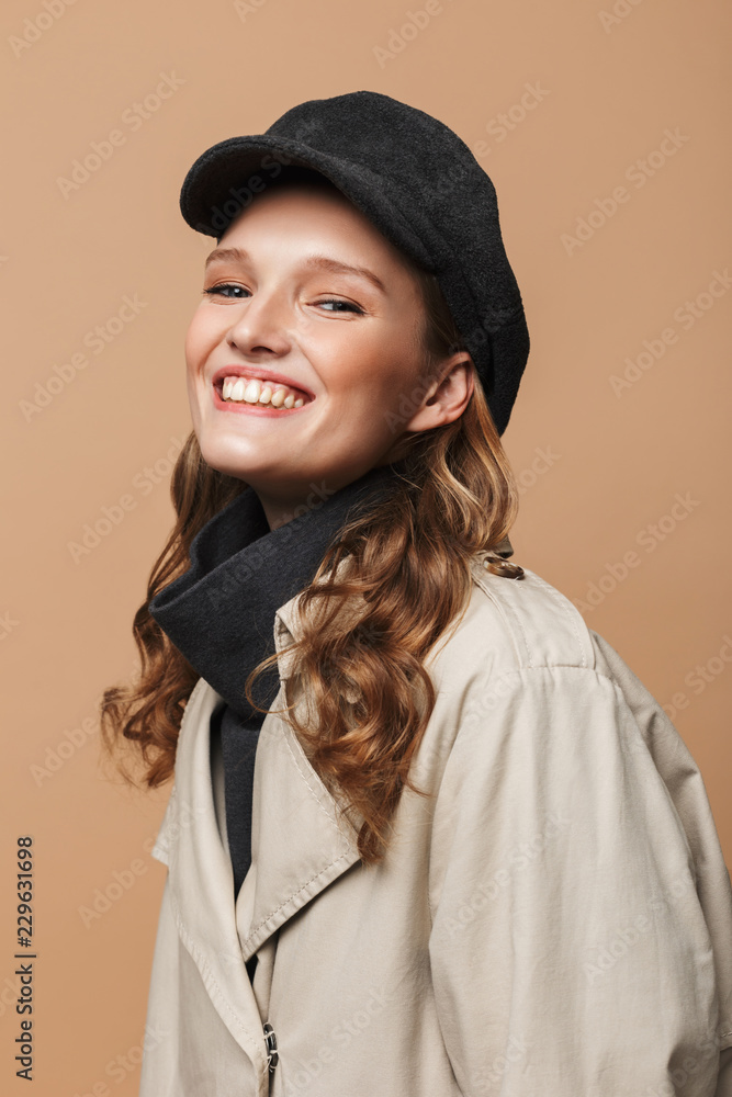 Young pretty cheerful woman with wavy hair in trench coat and cap joyfully looking in camera over beige background isolated