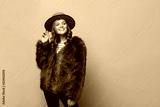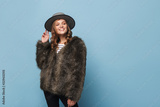 Young attractive smiling woman with wavy hair in fur jacket and hat happily looking aside over blue background isolated