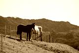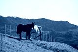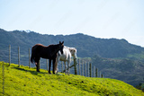 2 horses Black and brown color standing on the green grassland in front of the fence. Agriculture and livestock among the mountain.