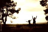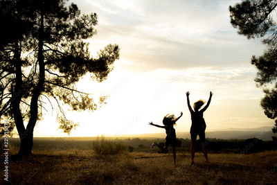 Backlight of a mother and daughter in a pine forest with yellow sky sunrise and sunset
