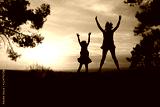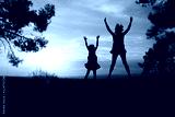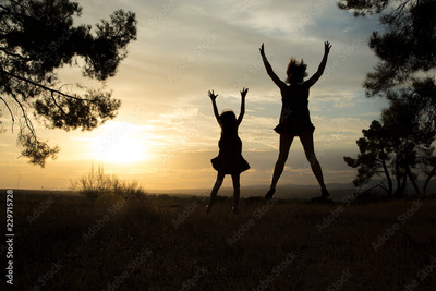 Backlight of a mother and her daughter jumping in a pine forest with yellow sky