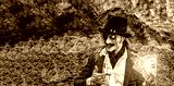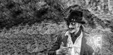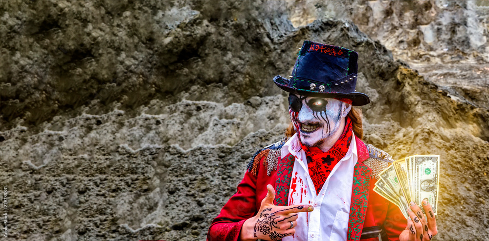 one-eyed pirate robber with eye patch and blood stains holds dollars, burning eye.