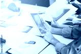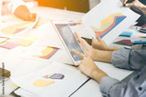 Bitcoin symbol on tablet app screen with big BUY and SELL buttons. Bitcoin on stock market. New digital money.