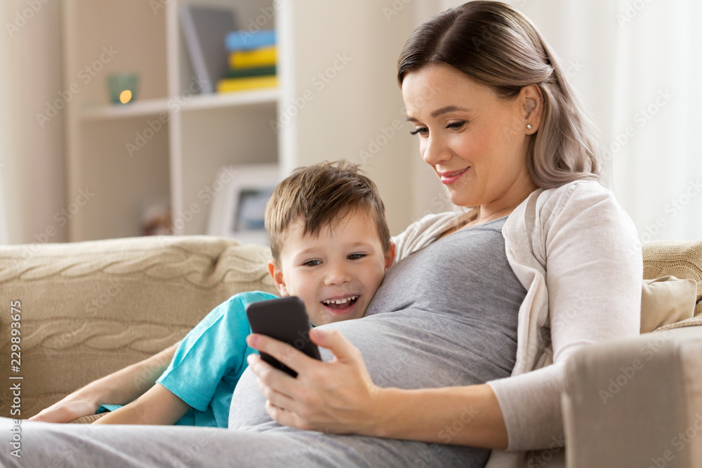 family, technology and pregnancy concept - happy pregnant mother and little son with smartphone at home