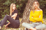 two girls having hard talk, polemic and argue between friends, sisters or roommate concept