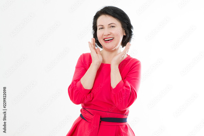 Smiling Middle age woman in red dress and perfect white teeth isolated on white background. Make up and fashion beauty concept. Copy space