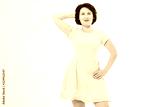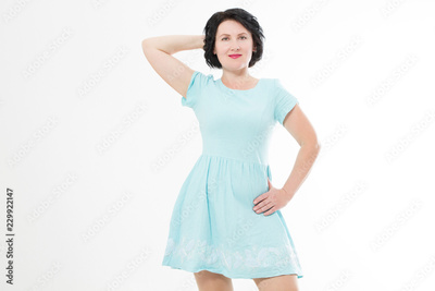 Happy middle age woman in fashion template blank dress with make up isolated on white background. Copy space