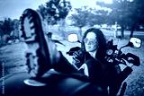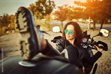 Young woman resting sitting on a motorcycle . Travel and tourism concept