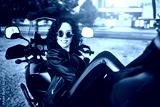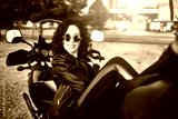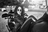 Young woman resting sitting on a motorcycle . Travel and tourism concept