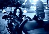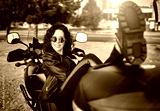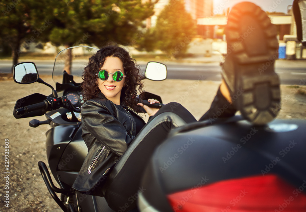 Young woman resting sitting on a motorcycle . Travel and tourism concept