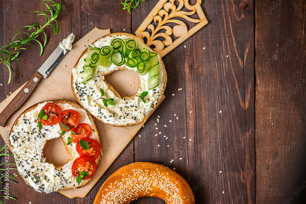 Bagels with cream cheese, sesame, tomato and cucumber on a wooden Board. Top view flat lay. With copy space