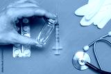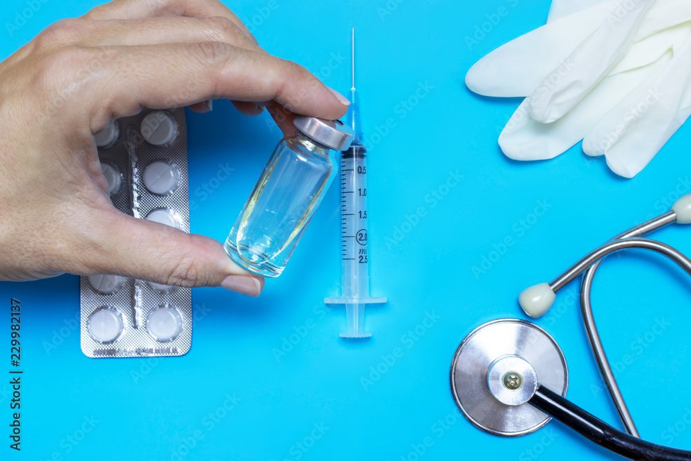 A hand taking a vial from blue background with syringe, stethoscope, gloves and tablets on it.