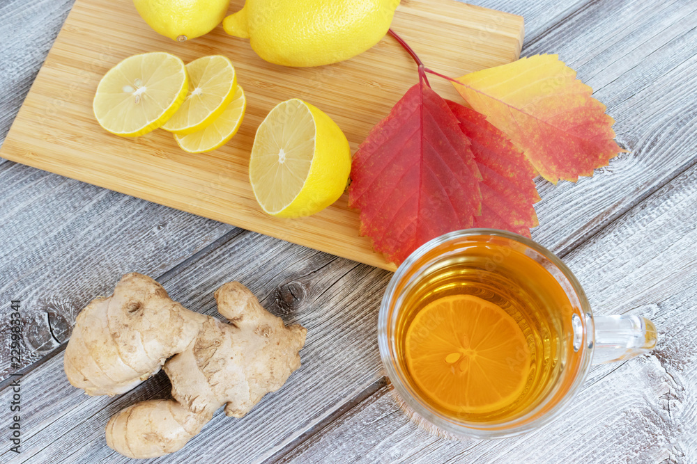 Ginger tea with lemon on a wooden table and pieces of diced lemon