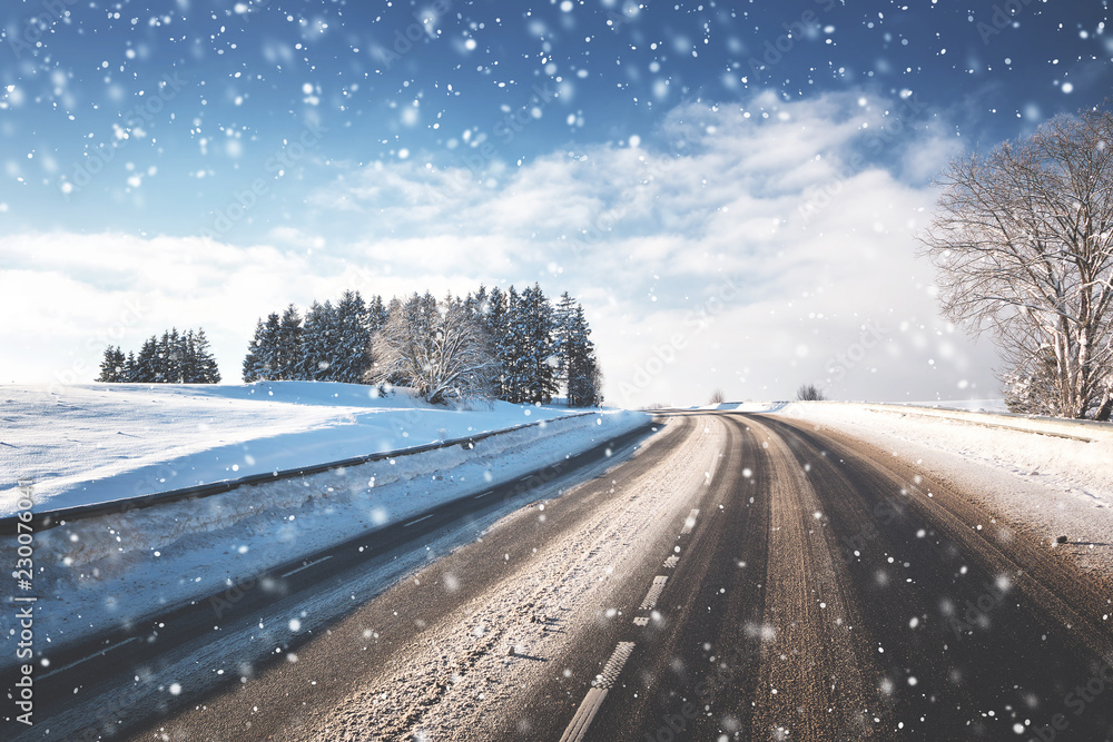 Asphalt road in snowy winter on beautiful frosty sunny day