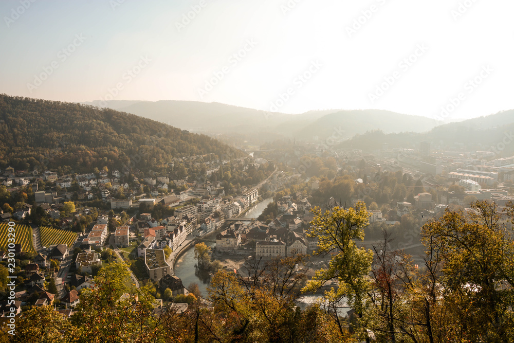 scenic panorama of a city in baden aargau switzerland in autumn with fog in background