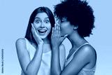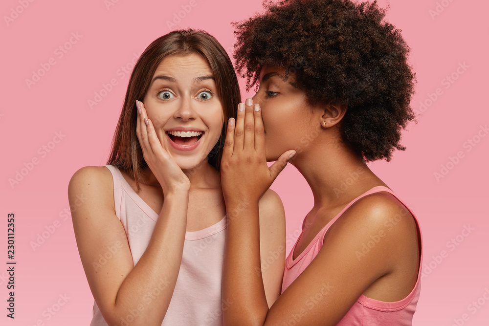 Young black woman whispers secret to her Caucasian friend, gossip together and spread rumours. Emotional European girl feels amazed to hear confidential information from companion. Secrecy, gossiping