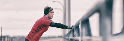 Run sport watch man in wearable technology smartwatch earphones and phone listening to music during winter running training outdoor- cold weather sportswear athlete runner banner.