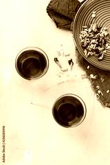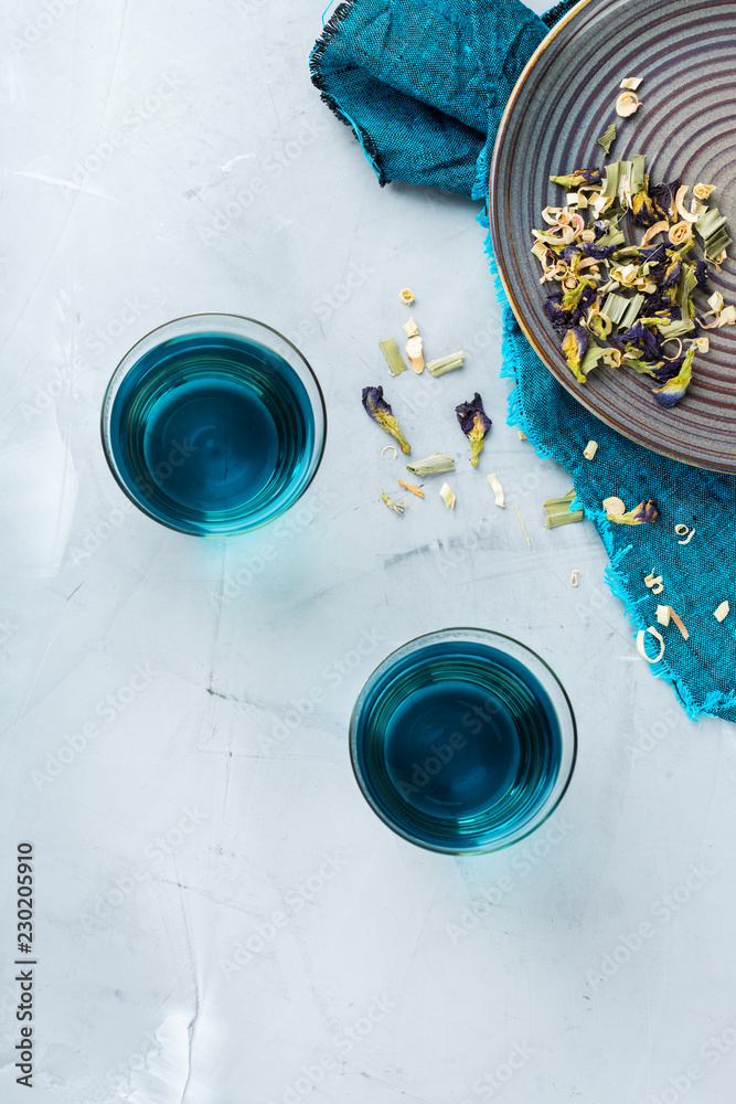 Blue butterfly pea flowers tea in a glass on table