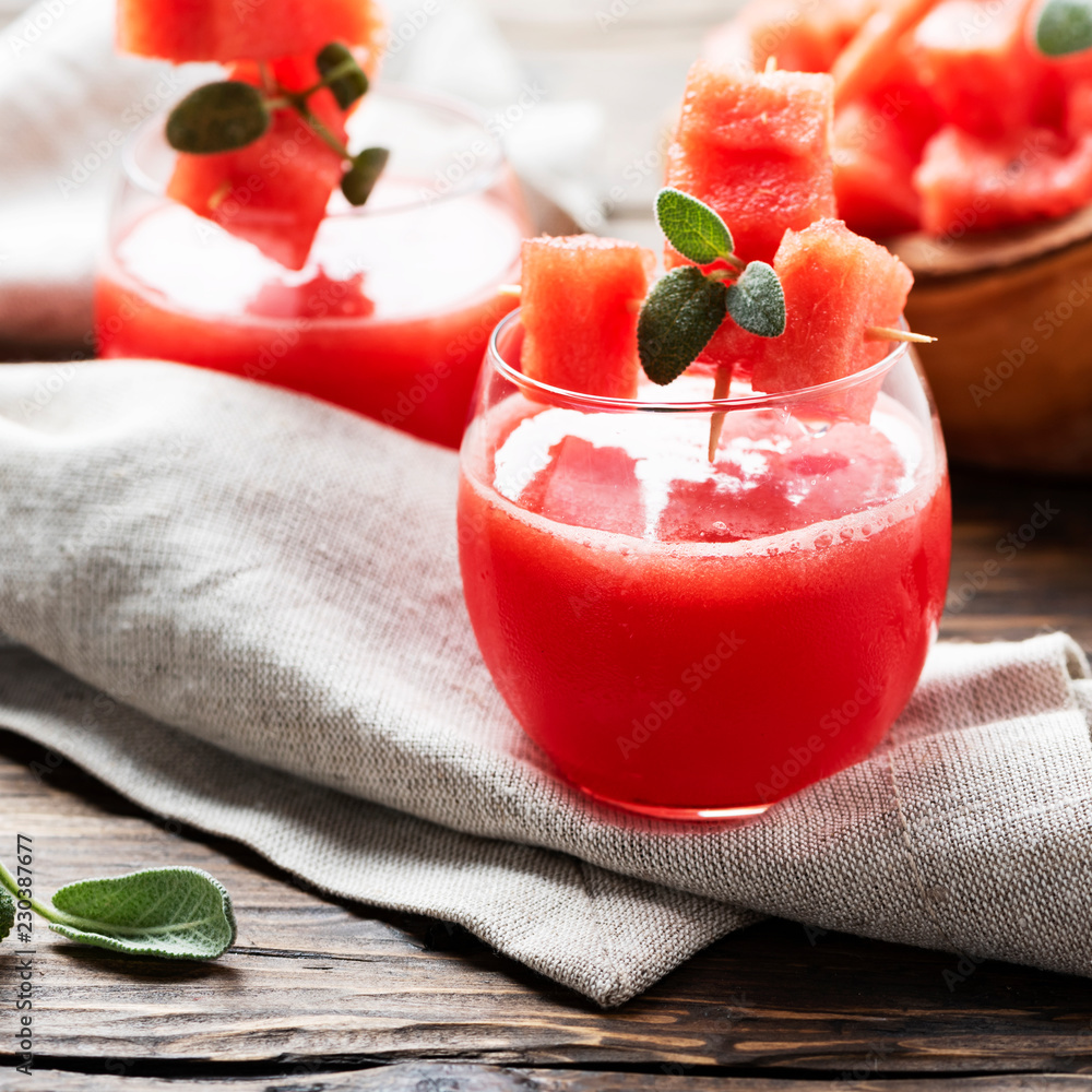 Cold watermelon juice with sage on the wooden table, selective focus and square image