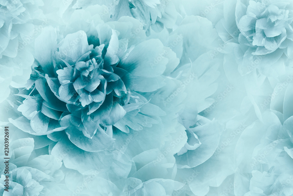 Floral turquoise background. Peonies flowers close-up on a transparent halftone light turquoise background. Greeting card. Nature..