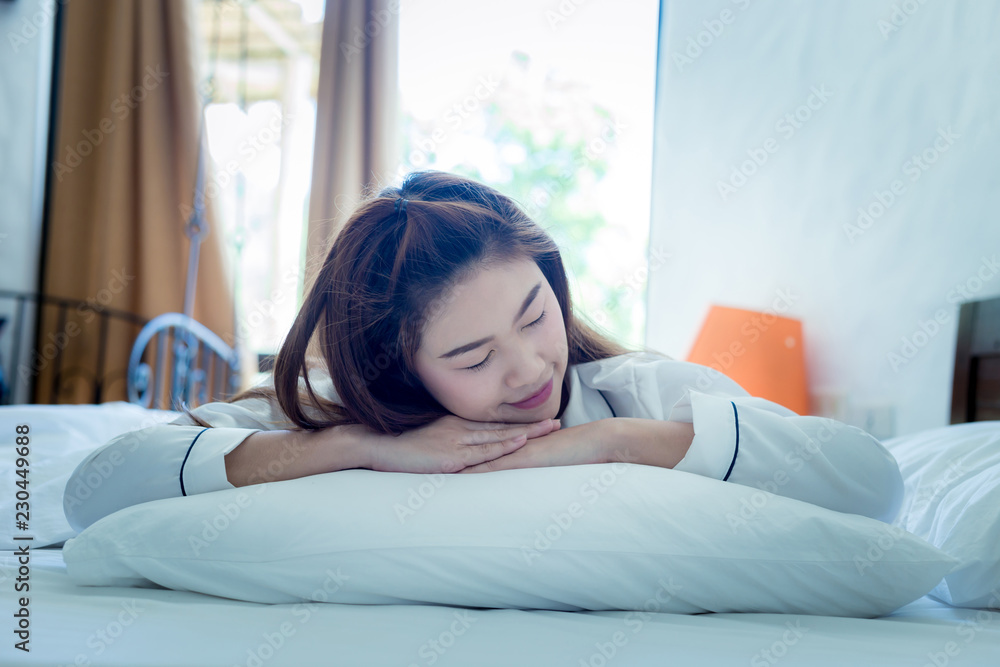 Beautiful Attractive Asian woman smile after sleep and sweet dream on bed in bedroom wake up in the morning,Healthcare Concept